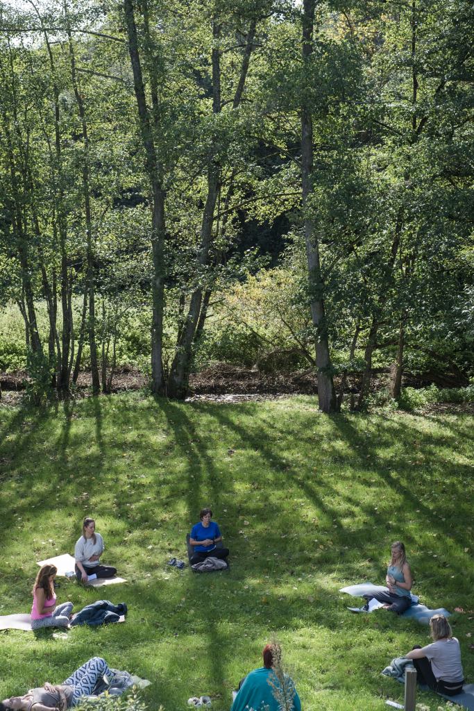 De meditatie- en yogalessen vinden plaats in de prachtige benedenruimte. Alle nodige yogamaterialen zijn aanwezig, alleen nog je eigen yogamatje en dekentje. Wie durft, kan zich verheerlijken op een ijsbad. Op zaterdag houden we een krachtige ceremonie rond het vuur in de tuin.