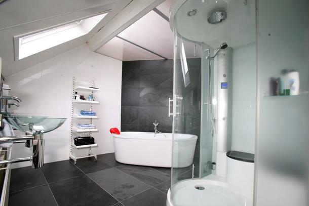 Optie 1: slaapzaal voor 4 personen met ieder een eigen, comfortabel éénpersoonsbed. In deze grote zolderkamer staan de bedden ruim van elkaar, met voldoende plaats voor jezelf en je spullen. Je deelt samen een ruime luxe badkamer met bad en afzonderlijke douche.