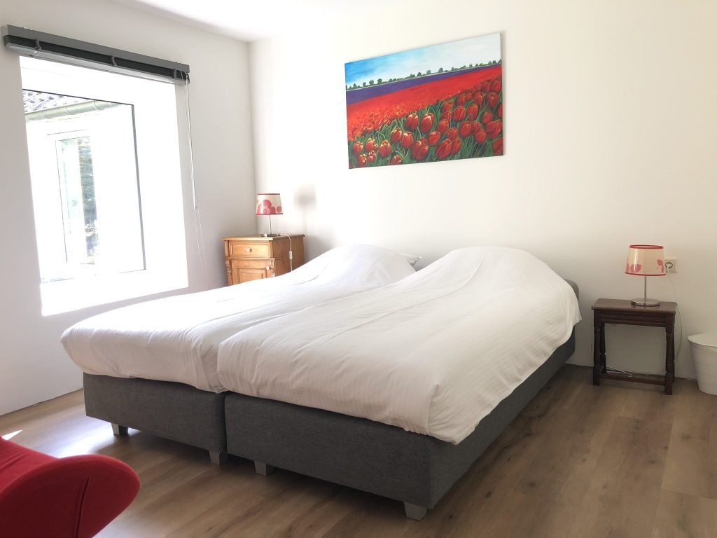 Optie 2: tweepersoonskamer met gedeelde badkamer. De bovenverdieping herbergt drie ruime tweepersoonskamers met ieder een eigen, comfortabel éénpersoonsbed, een gedeelde badkamer en afzonderlijk toilet.
