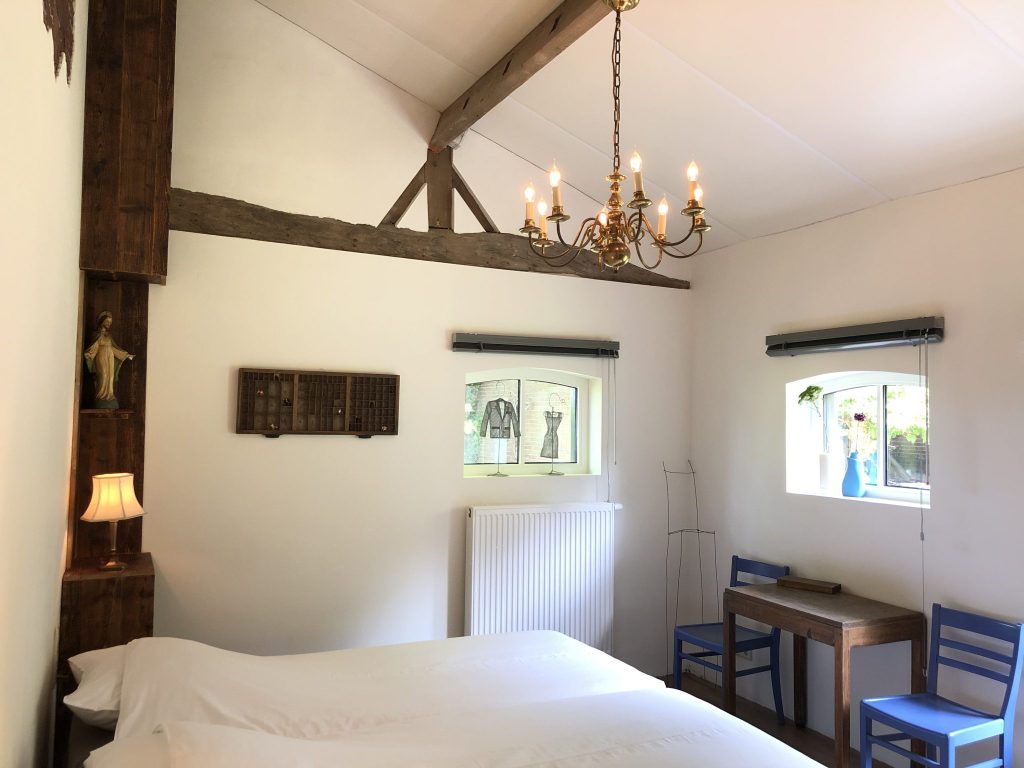 Optie 3: tweepersoonskamer met eigen badkamer. Op het gelijkvloers naast de yogazaal bevindt zich een tweepersoonskamer met ieder een eigen, comfortabel éénpersoonsbed, en met eigen badkamer met douche en toilet.